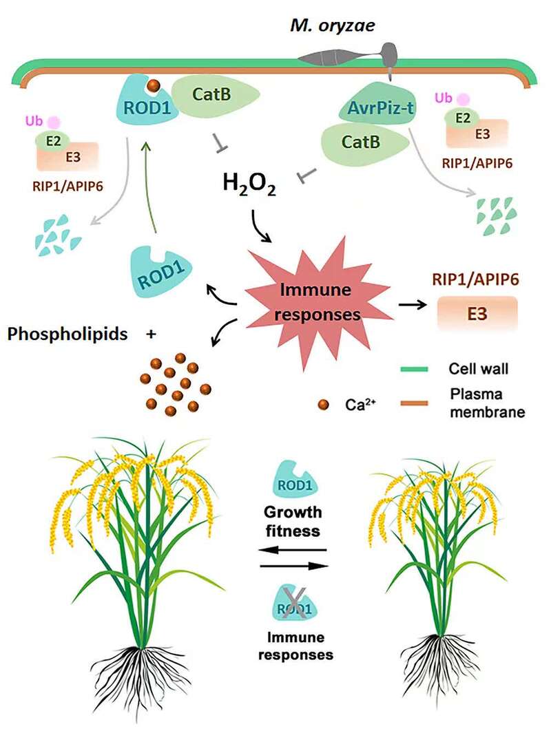 針對這些問題,何祖華團隊追蹤了15年。團隊研究發現ROD1作為一個新的植物免疫抑制中樞,通過降解具有免疫活性的超氧分子(ROS),從而抑制植物的防衛反應。因此,在沒有病原菌侵染時,植物的基礎免疫維持在較低水平,有利于水稻生殖生長,進而提高產量。但當病原菌侵染時,植物進化出了聰明的免疫激發新途徑:通過降解ROD1減弱其功能,從而保證植物在抵御病原菌時能產生有效的防衛反應,不至于迅速發病枯死,并能繁殖后代。