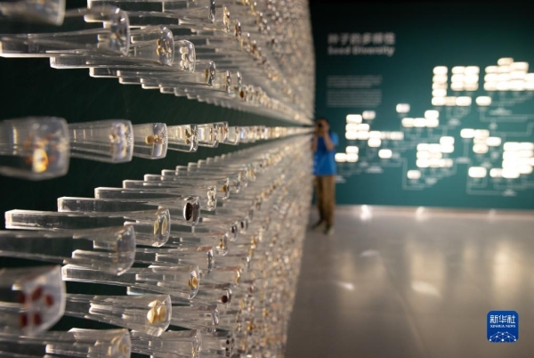 10月10日,在舉行發布會的中科院生物多樣性成果展現場,“種子圣殿”展墻展示種子多樣性。