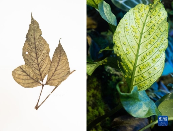 這是10月10日在昆明植物園拍攝的天星蕨。這張拼版照片分別為科研人員野外采集的標本(左)和在植物園遷地保護后存活下來的同種植物。新華社記者 金立旺攝