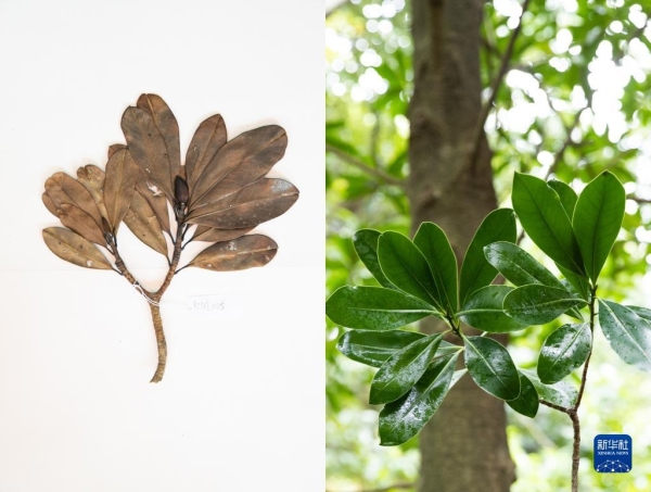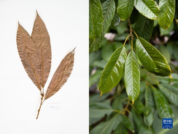 這是10月10日在昆明植物園拍攝的西疇青岡。這張拼版照片分別為科研人員野外采集的標本(左)和在植物園遷地保護后存活下來的同種植物。新華社記者 金立旺攝