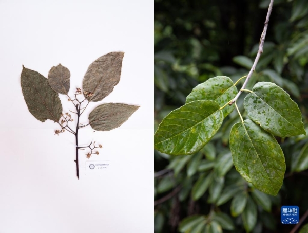 這是10月10日在昆明植物園拍攝的云南梧桐。這張拼版照片分別為科研人員野外采集的標本(左)和在植物園遷地保護后存活下來的同種植物。新華社記者 金立旺攝
