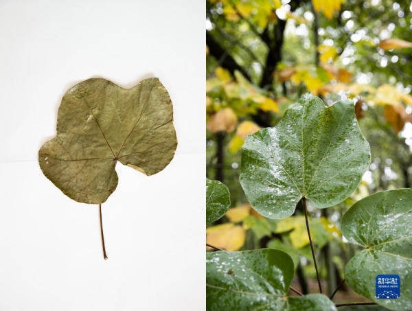 這是10月10日在昆明植物園拍攝的滇桐。這張拼版照片分別為科研人員野外采集的標本(左)和在植物園遷地保護后存活下來的同種植物。新華社記者 金立旺攝
