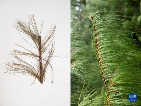 這是10月10日在昆明植物園拍攝的巧家五針松。這張拼版照片分別為科研人員野外采集的標本(左)和在植物園遷地保護后存活下來的同種植物。新華社記者 金立旺攝