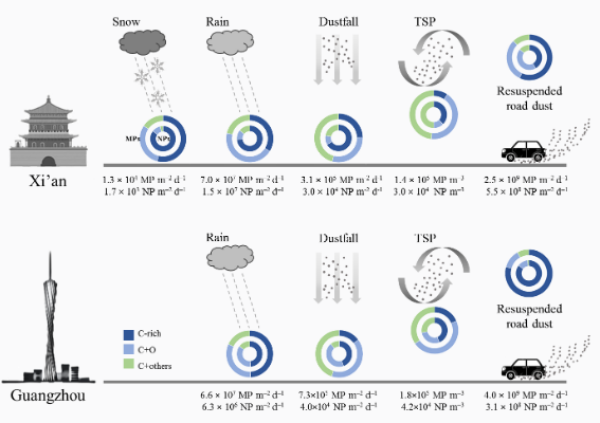 城市大氣微塑料和納米塑料豐度、通量與組成示意圖