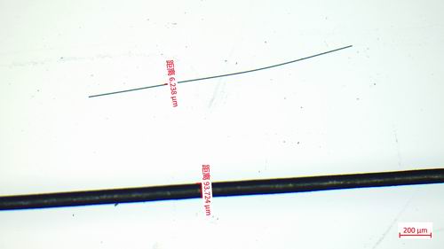 ②T1000級碳纖維單絲(上)與頭發絲的對比。山西煤化所供圖