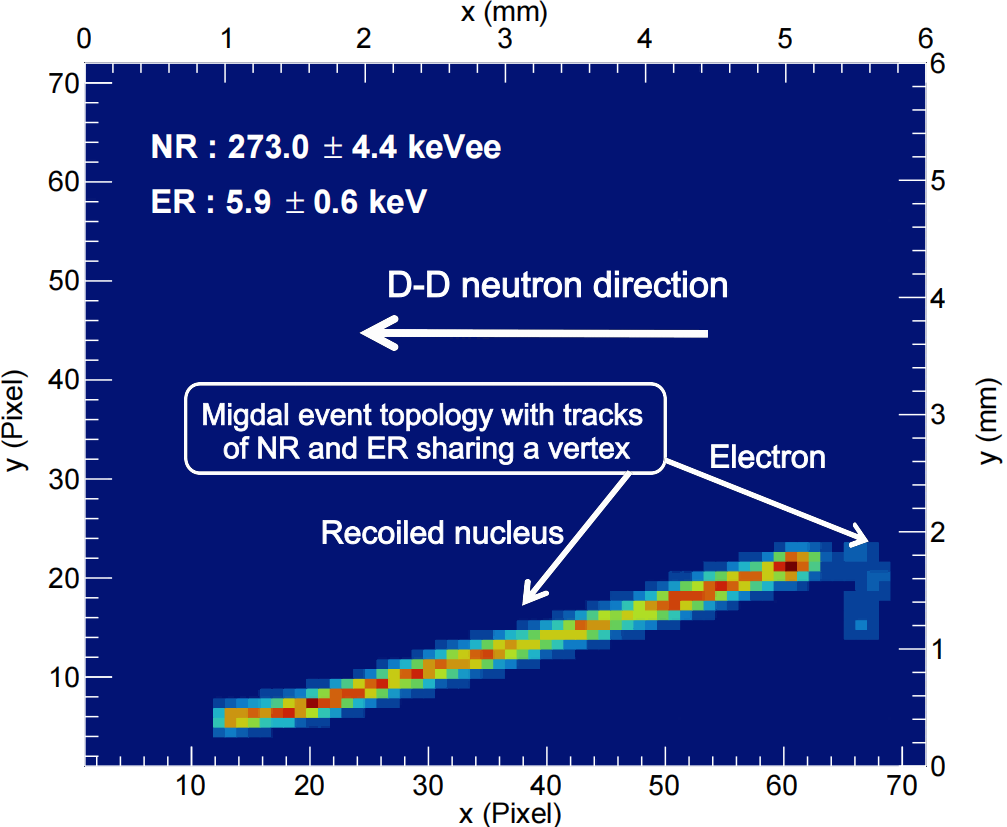 米格達爾效應由蘇聯著名物理學家阿爾卡季·米格達爾于1939年首次提出:一個原子的原子核突然獲得能量加速運動時,原子核在反沖過程中的內部電場變化將部分能量轉移給原子核外電子,使電子有概率獲得足夠能量脫離原子束縛,形成“共頂點”的兩條帶電徑跡。