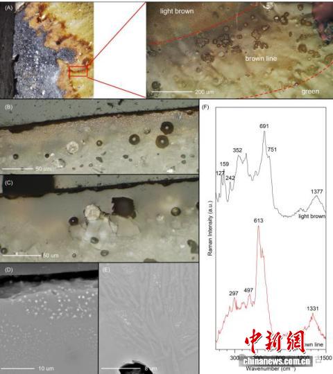 運用掃描電子顯微鏡、微區X射線熒光光譜、拉曼光譜等分析方法,聯合團隊對5件東晉至南朝時期的越窯點彩青瓷殘片展開顯微分析,在微尺度上揭秘早期彩瓷“燒前釉上彩”技術及一種特殊的三氧化二鐵晶體。