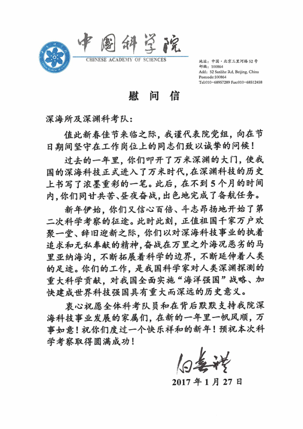 新年伊始,你們又信心百倍、斗志昂揚(yáng)地開始了第二次科學(xué)考察的征途。此時(shí)此刻,正值祖國千家萬戶歡聚一堂、辭舊迎新之際,你們以對(duì)深??萍际聵I(yè)的執(zhí)著追求和無私奉獻(xiàn)的精神,奮戰(zhàn)在萬里之外海況惡劣的馬里亞納海溝,不斷拓展著科學(xué)的邊界,不斷延伸著人類的足跡。你們的工作,是我國科學(xué)家對(duì)人類深淵探測(cè)的重大科學(xué)貢獻(xiàn),對(duì)我國全面實(shí)施“海洋強(qiáng)國”戰(zhàn)略、加快建成世界科技強(qiáng)國具有重大而深遠(yuǎn)的歷史意義。