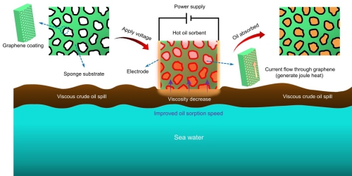 焦耳熱輔助石墨烯修飾的海綿快速吸附高粘度浮油示意圖