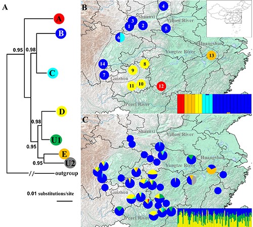 2008年以來,昆明動物所開始了對中國大鯢的研究。經過近10年的考察和走訪,研究團隊與國內外多個科研單位和林業部門合作,在全國范圍內收集到70個野生和1034個來自養殖場的中國大鯢樣品,對其野生和養殖種群遺傳結構進行深入研究。結合線粒體基因等的多項分析結果意外發現,中國大鯢并非單一物種,目前研究數據支持至少5個物種的劃分。這5個物種分布地與水系分布緊密相關,大致對應黃河、長江、珠江、錢塘江等水系流域。此外,在養殖場種群中意外發現了另外兩個獨特的支系,加之記錄的分布于海拔4000米的青藏高原種群,推測中國大鯢有可能包括高達8個物種。
