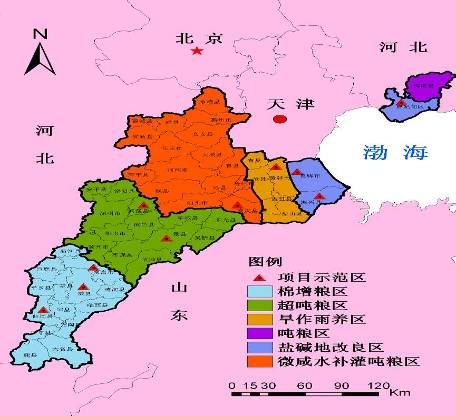 由中國科學院遺傳與發育生物學研究所農業資源中心與河北省農林科學院等單位在河北共同實施的渤海糧倉項目,按照分區集成構建了微咸水補灌噸糧、微灌水肥一體化、多水源聯合高效利用、雨養旱作增糧、棉田增糧、雜糧輕簡化栽培、鹽堿地適生種植、小麥玉米一年兩熟全程機械化等8套技術模式,5年累計示范推廣5197萬畝,增糧47.6億公斤,節水414.4億方,節本增效109.3億元。