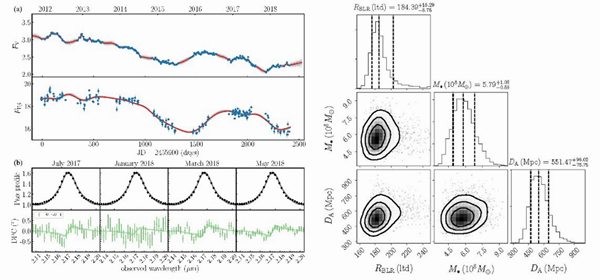 中國科學院高能物理研究所王建民團隊利用歐洲南方天文臺甚大望遠鏡的觀測數據,結合中科院云南天文臺2.4米望遠鏡和美國Steward天文臺Bok2.3米望遠鏡長達10年的反響映射數據,首次實現了對類星體3C 273宇宙學距離的直接測量,并用新方法計算了H0,為解決哈勃常數危機提供了新途徑。審稿人認為,這項工作是提高宇宙學距離測量精度的必經方案,十分及時和令人激動。相關成果于2020年1月13日發表在《自然-天文》上。