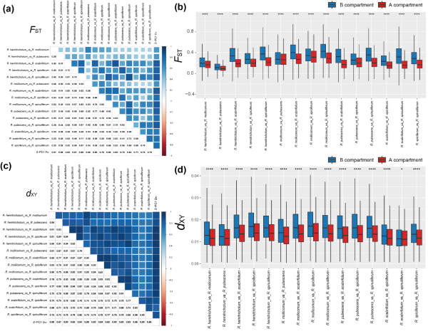 研究發現,染色體三維空間結構中的A區室與B區室在基因組分化程度上存在顯著差異。其中,與著絲粒緊密相關的B區室通常表現出較高的遺傳分化。而富含基因的A區室分化程度較低,并呈現更極端的??dm值,表明局部基因漸滲更為廣泛。