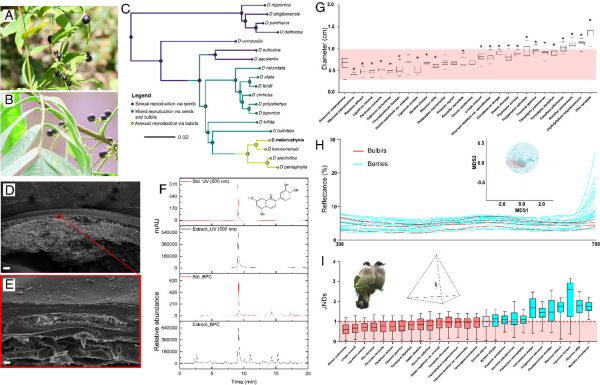 A-B珠芽與相似的漿果;C黑珠芽薯蕷在薯蕷屬系統發育樹中的位置;D-F珠芽表皮結構與色素;G-I珠芽對漿果的模擬。