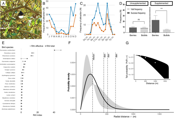 A-C、E紅外相機記錄下的珠芽被訪問的時間規律與訪問者組成;D實驗室環境下鳥類對珠芽與漿果的選擇實驗;F-G數學模型中珠芽的擴散距離。
