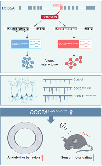研究基于人腦轉錄組數據,采用基于Junction count的創新分析策略,克服了傳統方法僅能檢測已知異構體的局限,系統識別出1.7萬余個與精神分裂癥相關的剪接信號,其中包含大量尚未被注釋的可變剪接事件。通過精細篩選與實驗驗證,團隊聚焦于16p11.2區域的一個同義突變rs3935873。該變異并非沉默,而是充當了一個精準的“剪接開關”,特異性驅動DOC2A基因產生一個全新剪接異構體DOC2A?Val217-Pro218,卻不影響其全長轉錄本的表達。