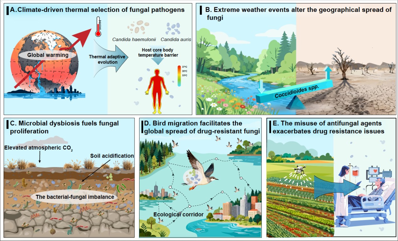 真菌病原體涌現的環境與人為驅動因素示意圖