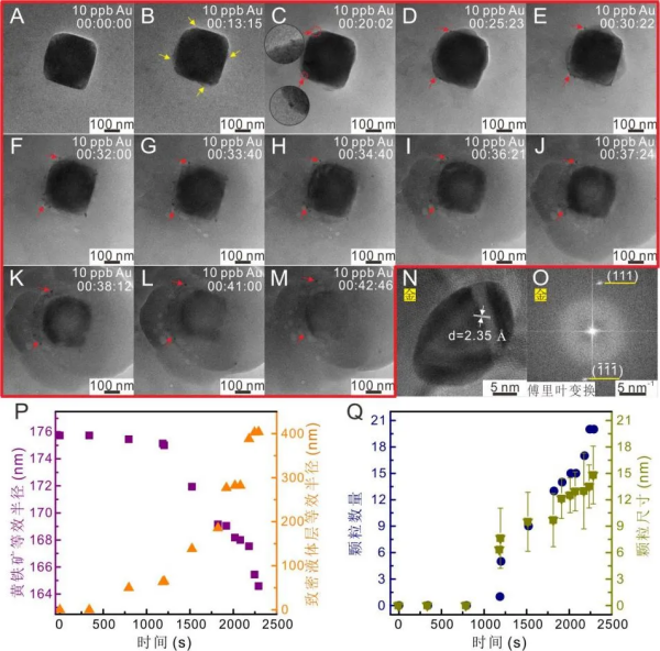 研究團隊在排除溶解氧和電子束干擾的前提下,通過原位液相透射電子顯微鏡等多尺度、多手段聯(lián)用技術(shù),實時觀測了黃鐵礦與10ppb(十億分之十)的極低濃度含金溶液的反應(yīng)過程。
