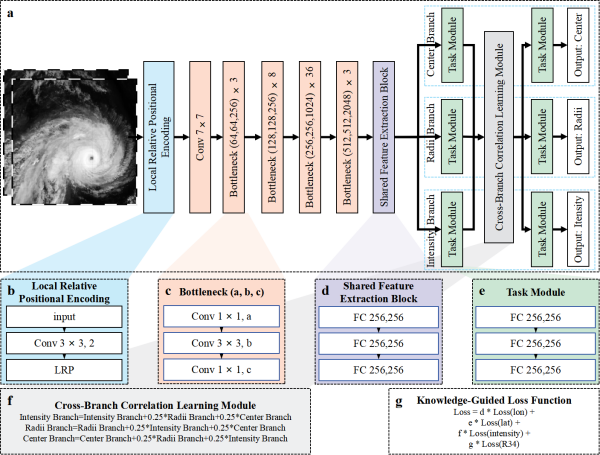 研究構建了知識引導的通用臺風監測模型(KG-TCM)智能監測框架,以未對齊的紅外衛星云圖作為輸入,通過包含局部相對位置編碼的主干網絡提取多尺度空間特征,經由共享特征提取模塊分流至中心定位、強度反演和風圈半徑反演三個任務分支??蚣芤蔡貏e引入了跨分支關聯學習模塊,以強化任務間的信息交互,并結合知識引導的損失函數進行物理約束。在一次前向傳播中,研究實現對臺風三大核心要素的同步與物理一致性監測。