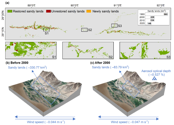 研究發(fā)現(xiàn),自1990年國(guó)家啟動(dòng)規(guī)模化“一江兩河”“退耕還林”“西藏生態(tài)安全屏障保護(hù)與建設(shè)工程”“兩江四河”等生態(tài)工程以來(lái),雅魯藏布江中游的荒漠化蔓延趨勢(shì)被成功遏制。河岸沙化土地恢復(fù)率顯著提升至59%,人工林覆蓋面積實(shí)現(xiàn)了從133.85平方公里到419.54平方公里的跨越式增長(zhǎng),增幅高達(dá)213%。在全球持續(xù)變暖的背景下,自2000年起,國(guó)家持續(xù)投入的生態(tài)建設(shè)開(kāi)始顯現(xiàn)深度氣候調(diào)節(jié)效應(yīng),表現(xiàn)為地表溫度平均降低2.64℃,近地表氣溫下降0.3℃,土壤含水量提升2.74%,空氣濕度增加2.18%。