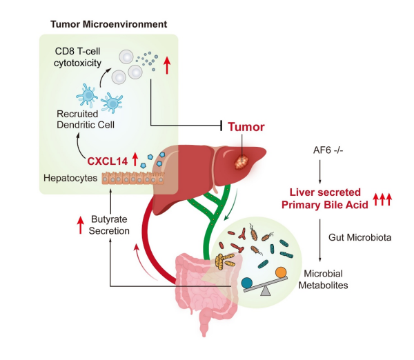 研究顯示,初級膽汁酸/丁酸/CXCL14形成代謝—免疫作用軸,來改善腫瘤抑制性免疫微環境,從而抑制肝癌進展。研究發現了極性蛋白AF6是肝上皮細胞膽汁酸合成酶的核心調控子,并明確了AF6通過調控膽汁酸代謝穩態改善肝臟抑制性免疫微環境的作用機制。這為未來肝癌患者的臨床治療提供了新的治療手段。