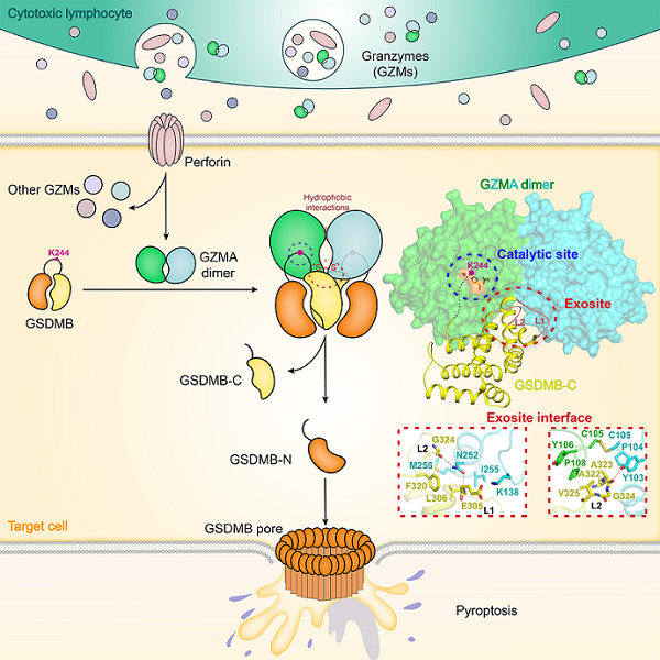 1月26日,中國科學院生物物理研究所等研究團隊,揭示了具有二聚體結構特征的GZMA可利用專門的外位點,特異性識別焦亡蛋白GSDMB的結構基礎,并破解了殺傷性淋巴細胞GZMA介導靶細胞焦亡的精確機理。