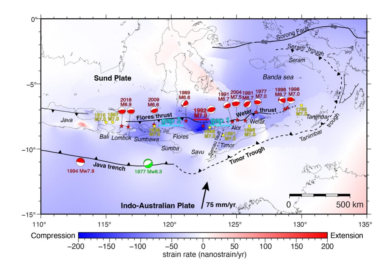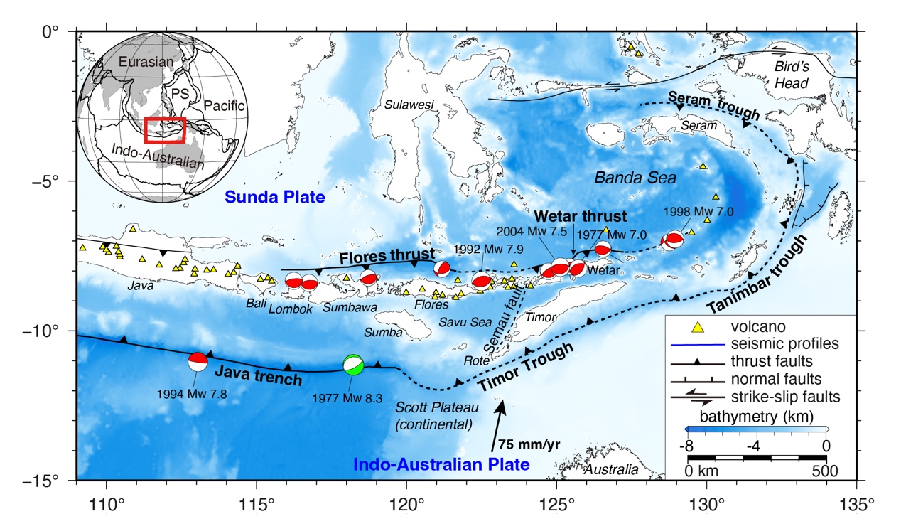 研究結果表明,弧后弗洛勒斯—韋塔反沖斷裂與弧前帝汶海槽,共同吸收了印—澳板塊與巽他板塊約75 mm/yr的匯聚速率。其中,弗洛勒斯—韋塔斷裂滑動速率為7.6mm/yr至23.9mm/yr,是區域大多數強震(MW6.6)的發震構造,包括1992年MW7.9弗洛勒斯地震及其引發的海嘯災害。帝汶海槽滑動速率為13.3mm/yr至30.7mm/yr,但近百年來儀器觀測未記錄到強震活動,地表及淺部構造活動跡象相對較弱。