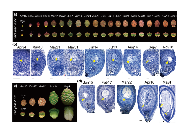 近日,中國(guó)科學(xué)院植物研究所選取松科不同生殖周期類型的代表性物種——油松(Pinus tabuliformis)、長(zhǎng)葉云杉(Picea smithiana)和雪松(Cedrus deodara),基于解剖觀察、時(shí)序轉(zhuǎn)錄組比較、異源轉(zhuǎn)化驗(yàn)證等手段,開(kāi)展了雌配子體的發(fā)育及其遺傳調(diào)控機(jī)制研究。