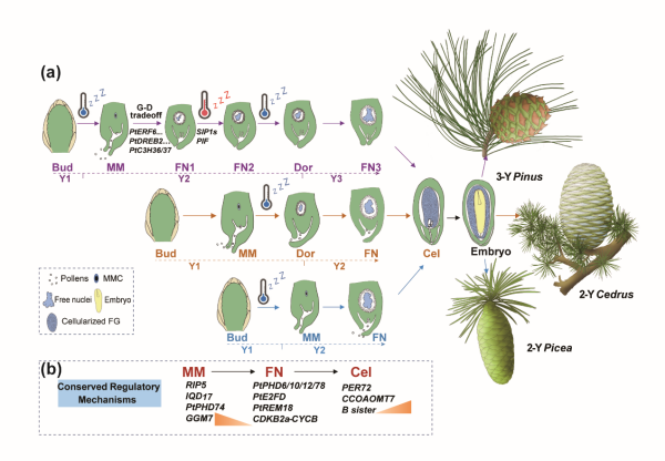 研究進(jìn)一步聚焦于松屬植物漫長(zhǎng)的生殖周期,發(fā)現(xiàn)雌配子體在授粉后的早期游離核階段發(fā)育遲緩是其主要成因,導(dǎo)致“球果”進(jìn)入“夏季休眠”狀態(tài)。該游離核階段可細(xì)分為兩個(gè)時(shí)期:時(shí)期I中,“球果”可能因免疫應(yīng)答反應(yīng)而導(dǎo)致發(fā)育減緩,ORA47、TZF9等轉(zhuǎn)錄因子在該時(shí)期發(fā)揮關(guān)鍵調(diào)控作用;時(shí)期II中,“球果”通過(guò)響應(yīng)高溫及熱脅迫逐步進(jìn)入休眠狀態(tài),SIP1s和PIF類轉(zhuǎn)錄因子參與該過(guò)程。基于此,該研究推測(cè)松屬“球果”通過(guò)減緩發(fā)育以應(yīng)對(duì)外界脅迫,是一種適應(yīng)性進(jìn)化策略。