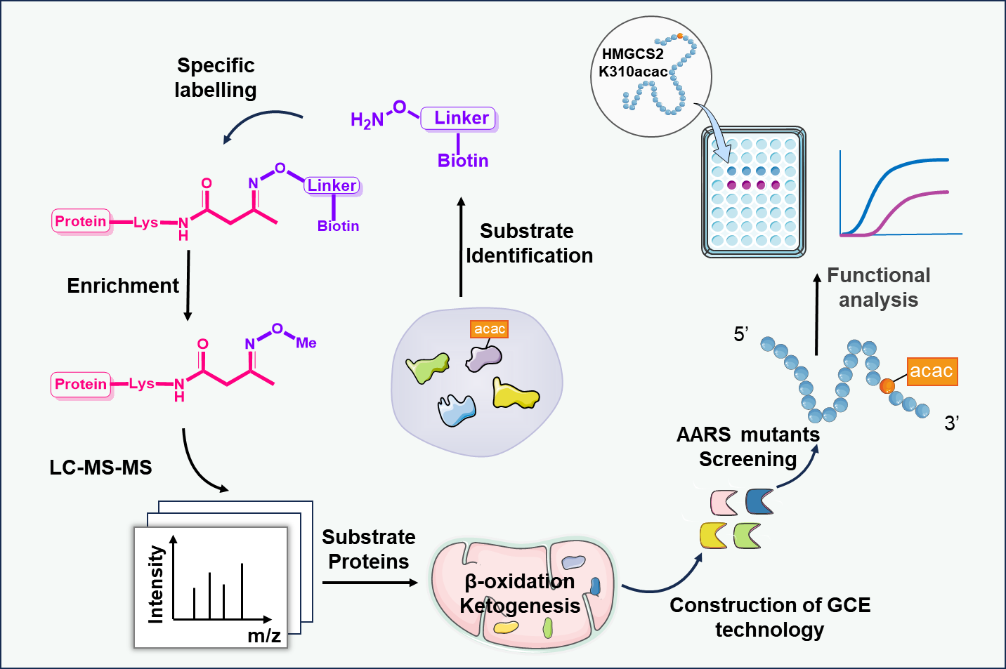 研究團隊利用Kacac修飾特有的酮羰基反應活性,設計并合成了新型化學探針Aca-Bio。該探針可與Kacac側鏈形成pH響應性可逆肟鍵,從而實現對Kacac修飾肽段的高選擇性標記、富集與可控釋放。團隊利用該策略對禁食小鼠肝臟進行化學蛋白質組學分析,共鑒定出分布于125個蛋白質上的260個Kacac修飾位點,大幅拓展了已知Kacac底物譜,并揭示了該修飾在三羧酸循環、酮體生成等核心代謝通路中呈現明顯富集特征。