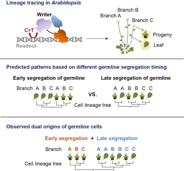 基于該細胞譜系樹,研究團隊發(fā)現(xiàn)擬南芥生殖系細胞存在兩種分離模式:部分生殖細胞在花序分生組織形成過程中分離,另一些則在更早階段,在分枝形成之前即已分離。后者類似于動物中的魏斯曼屏障,揭示了擬南芥中存在比現(xiàn)有認知更早期的生殖系分離過程。該發(fā)現(xiàn)為理解植物如何限制突變向后代傳遞、維持基因組穩(wěn)定性提供了新證據(jù)。