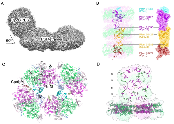 該研究首次從原子和近原子水平揭示了藍(lán)藻PSI-CpcL-PBS超級(jí)復(fù)合體整體在光合膜上的組裝方式,闡明了CpcL介導(dǎo)PBS與PSI結(jié)合的分子機(jī)制,為理解藍(lán)藻PSI特異性捕光天線的組裝和光能傳遞提供了重要結(jié)構(gòu)基礎(chǔ)。