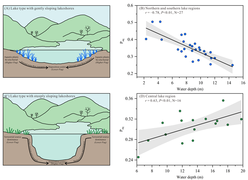針對上述問題,中國科學(xué)院南京地理與湖泊研究所研究團隊提出了湖泊水下地形調(diào)控正構(gòu)烷烴Paq指標與水位關(guān)系的假說。云南洱海水下地形具有北部、南部湖盆較平緩與中部湖盆較陡峭的地形特征,研究團隊將其選為研究對象,并通過系統(tǒng)調(diào)查該湖泊陸生植被與水生植被、湖泊沉積物中正構(gòu)烷烴組成及空間分布特征發(fā)現(xiàn),湖泊表層沉積物中長鏈與中鏈正構(gòu)烷烴分別來自河流搬運輸入和水生植物原地埋藏,且全湖湖泊表層沉積物樣品的Paq指標與湖泊水位相關(guān)性較弱,這表明水下地形在變化情況下,Paq指標與水位的關(guān)系較為復(fù)雜。研究團隊進一步將研究區(qū)域劃分為北部、南部(緩坡型)及中部(陡坡型),發(fā)現(xiàn)Paq指標與湖泊水位的相關(guān)性顯著提升,但呈現(xiàn)兩種相反的相關(guān)性結(jié)果,上述結(jié)果證實了湖泊水下地形對正構(gòu)烷烴指標在古水位解譯中具有調(diào)控作用的研究假說。