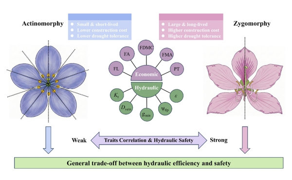 花的對稱性是被子植物多樣化和生態適應的關鍵驅動力。傳統研究多聚焦于花對稱性與傳粉者協同進化的形態學關聯,不同對稱形式的花在水分運輸、儲存及抗旱策略等生理維度是否存在差異,尚缺乏系統研究。闡明花對稱性與水力策略的內在關聯,對理解被子植物演化及環境適應機制具有重要意義。