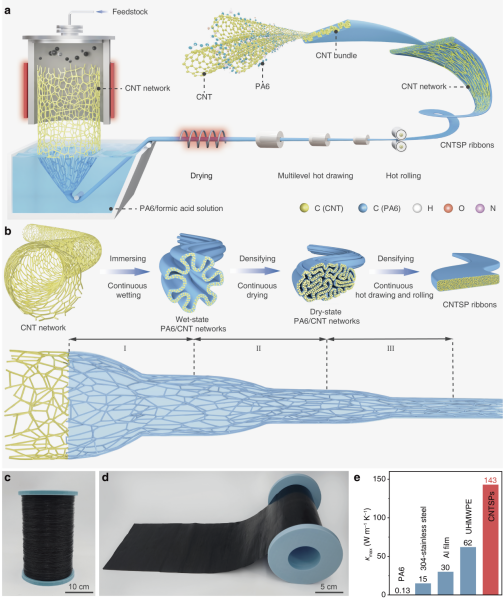 研究團(tuán)隊(duì)采用浮動(dòng)催化劑化學(xué)氣相沉積法制備出長(zhǎng)碳納米管網(wǎng)絡(luò),將其浸入聚酰胺6(PA6)/甲酸溶液中,實(shí)現(xiàn)了高達(dá)59wt%的碳納米管負(fù)載。該過(guò)程既保留了碳納米管原有的高長(zhǎng)徑比,又促使其與聚合物分子發(fā)生自發(fā)融合,有效提升了碳納米管的取向度與堆積密度。這種特殊的微觀結(jié)構(gòu)賦予了碳納米管超級(jí)塑料卓越的熱學(xué)性能,且呈現(xiàn)出高度定向的傳熱特性。同時(shí),該材料還兼具優(yōu)異的力學(xué)與電學(xué)性能。
