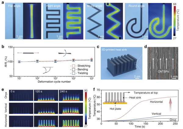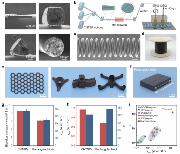 近日,中國(guó)科學(xué)院蘇州納米技術(shù)與納米仿生研究所等開發(fā)出一種可規(guī)模化制備的原位碳納米管—聚合物融合與熱加工工藝,成功制備出兼具超高性能與優(yōu)異加工性的碳納米管超級(jí)塑料(CNTSP)。該材料實(shí)現(xiàn)了定向高熱導(dǎo)、高強(qiáng)高導(dǎo)的特性,且可通過(guò)3D打印、熱壓成型制備成各類結(jié)構(gòu),為電子器件高效熱管理提供了全新解決方案。