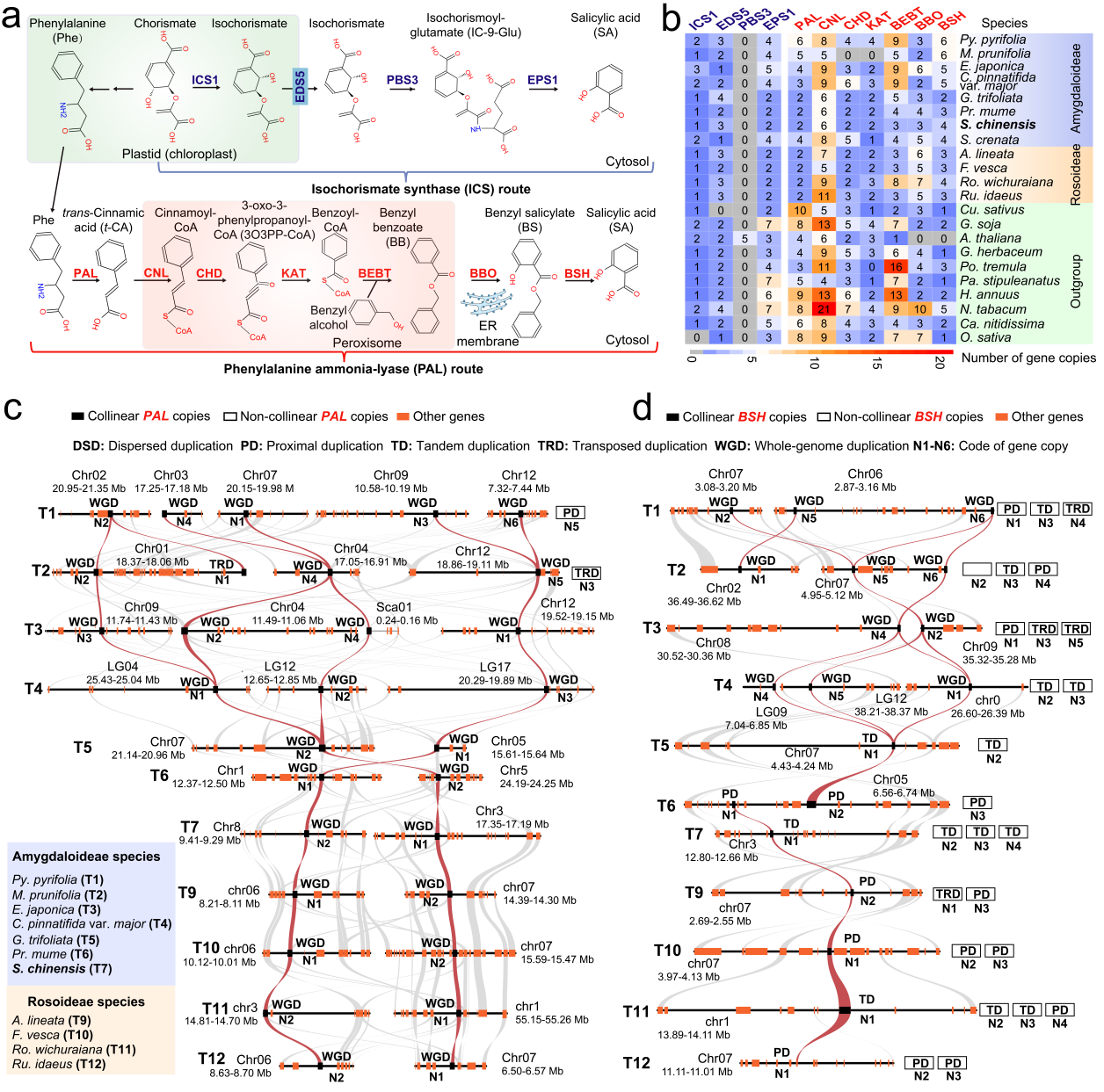 研究結(jié)果表明,PAL介導(dǎo)的途徑是薔薇科SA生物合成的主導(dǎo)路徑,并在進化上高度保守。在李亞科物種中,該通路主要通過WGD擴張;而在薔薇亞科中,則由WGD與小尺度復(fù)制(SSD)共同驅(qū)動。來源于WGD的基因普遍具有良好的共線性,并維持穩(wěn)定高表達;而SSD來源的基因則表現(xiàn)出共線性降低和表達模式差異,反映出復(fù)制后的調(diào)控分化與亞功能化過程。