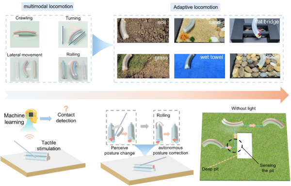 團(tuán)隊進(jìn)一步利用機器人感知—驅(qū)動一體化設(shè)計優(yōu)勢,使機器人能夠基于自身感知信息進(jìn)行環(huán)境感知與運動決策。機器人能夠在有光和黑暗環(huán)境下感知前方深坑,主動調(diào)整路徑繞行通過(障礙繞行);通過實時感知身體壓縮量,自動調(diào)節(jié)運動幅度穿越低矮隧道(窄道穿越);能夠?qū)崟r感知自身姿態(tài),在移動中發(fā)生側(cè)翻時自動調(diào)整恢復(fù)穩(wěn)定運動(姿態(tài)自恢復(fù));借助機器學(xué)習(xí)方法,可對不同類型的外界交互刺激進(jìn)行識別與分類(外界刺激識別)。