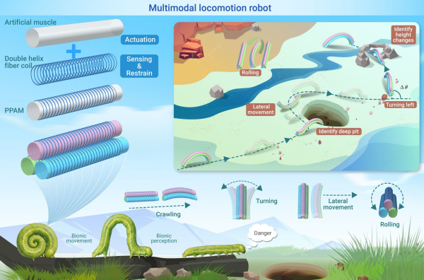 近日,中國科學(xué)技術(shù)大學(xué)研制出雙螺旋纖維增強的自感知人工肌肉,并基于三組人工肌肉的模塊化組合,構(gòu)建出多模態(tài)仿生移動機器人,能夠?qū)崿F(xiàn)四種運動模式,具備多地形自適應(yīng)移動與外界刺激感知決策能力。該研究為高度智能化探索作業(yè)機器人的發(fā)展提供了新的技術(shù)路徑,也為基于人工肌肉構(gòu)建感知型柔性操作器提供了新的設(shè)計思路。