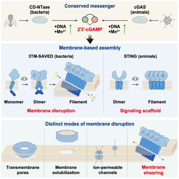 這項研究從信號分子、受體機制和效應執行三個層面,拓展了學界對天然免疫進化多樣性的理解,揭示了2'3'-cGAMP在原核生物中的保守生成機制,闡明了其特異性驅動跨膜效應蛋白變構與高階裝配的過程,為理解天然免疫信號體系演化多樣性和膜蛋白破壞生物膜機制提供了新視角。