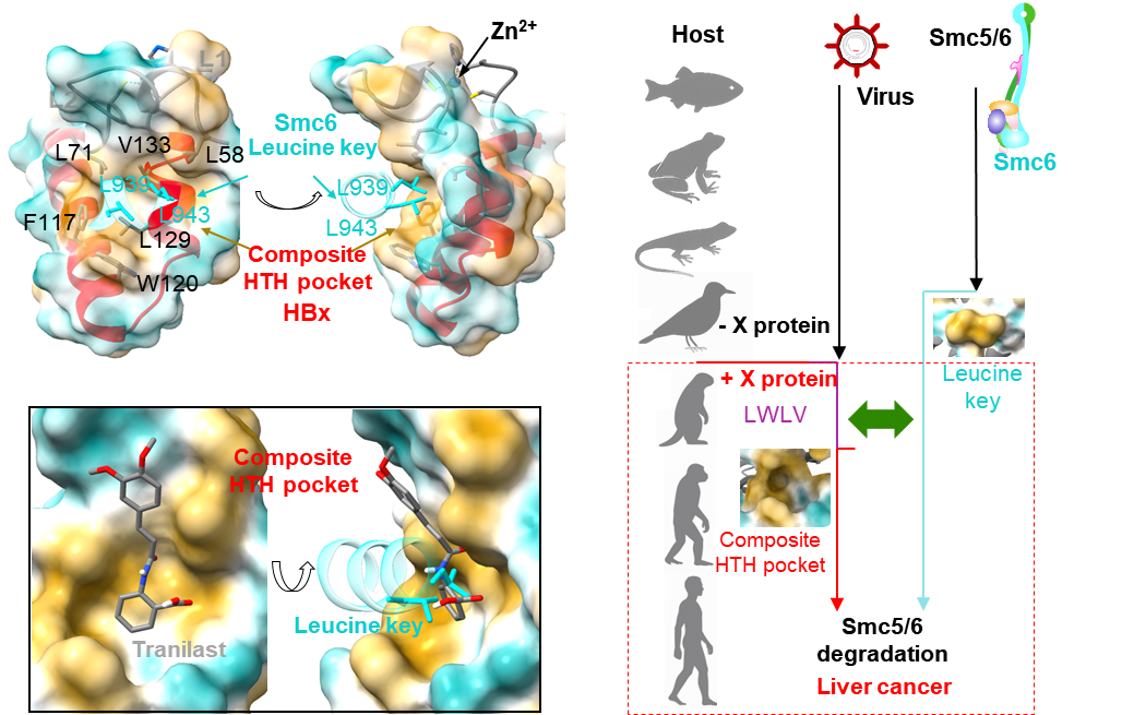 研究同時發(fā)現(xiàn),Smc5/6復(fù)合物參與基因組穩(wěn)定性維持及DNA損傷修復(fù)。哺乳動物感染嗜肝病毒后,其X蛋白介導(dǎo)的Smc5/6降解可導(dǎo)致基因組穩(wěn)定性受損。此外,HBV慢性感染中,病毒基因組整合至宿主基因組的比例近乎100%。其表達的HBx截短突變體中,帶有組成型HTH口袋的突變體可維持對Smc5/6的降解能力。序列比對顯示,構(gòu)成HBx組合型HTH疏水口袋的氨基酸殘基在所有HBV基因型乃至數(shù)千年前的古代HBV株中均一致。嗜肝病毒進化分析表明,X基因出現(xiàn)于哺乳動物肝炎病毒中,且該疏水口袋高度保守;從宿主角度看,Smc6的“亮氨酸鑰匙”在鳥類中已出現(xiàn),并在哺乳動物中完全保守,提示二者存在共進化關(guān)系。這與僅在受感染哺乳動物中出現(xiàn)原發(fā)性肝細胞癌的表型一致,表明X介導(dǎo)的Smc5/6降解可能對肝細胞癌發(fā)生具有重要影響。因此,阻斷HBx-Smc6相互作用,有望成為抑制病毒復(fù)制并延緩肝炎向肝細胞癌轉(zhuǎn)化的潛在新靶點。