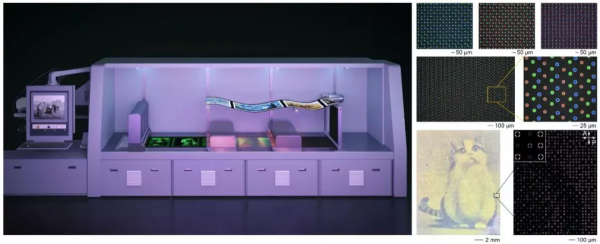 針對以上問題,團隊首先從結構著手,創制出一種由周期性納米晶格構成的微米尺度半球形結構。該結構通過協同光子晶格與光學界面的耦合作用,對多尺度下的光學傳輸行為進行精準調控,使微納基元展現出豐富光學響應與動態色彩變換,光影流轉宛若萬花筒,一轉千色。在規模化制備方面,團隊研發了高通量按需打印與卷對卷連續制造工藝,就像報紙印刷一樣,將柔性基材從一個滾筒連續輸送到另一個滾筒,連續完成納米級精度打印成型,這一技術可將低成本聚合物納米材料快速制備為單像素性能定制的光學超材料,實現跨越多個尺度的精準制造。