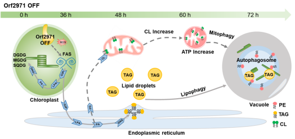 研究還發現Orf2971缺失后細胞內的心磷脂含量明顯富集,富集的心磷脂會導致線粒體數量增加,形狀近似圓球,嵴結構變得密集,心磷脂外移,呼吸作用加強,并可能發生線粒體自噬等。這說明增多的心磷脂會通過增強線粒體功能來補償葉綠體功能的下調,進而維持細胞穩態。這些研究結果為脂質和自噬參與維持葉綠體蛋白穩態調控途徑提供了新見解。