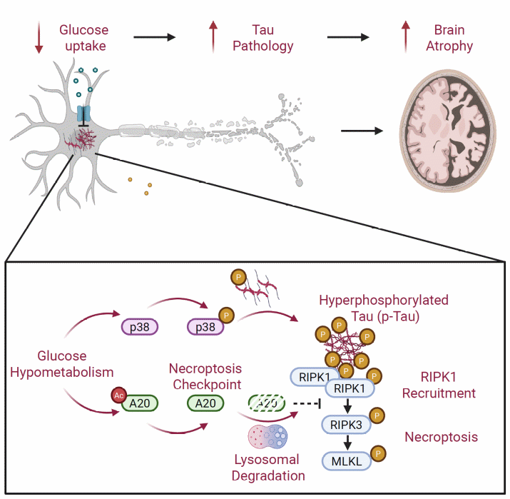 該研究揭示了一條由p-Tau–RIPK1軸介導的代謝驅動型程序性壞死機制,為理解大腦葡萄糖代謝與Tau病理之間的功能聯系提供了依據,并為阿爾茨海默病的干預策略提供了新思路。
