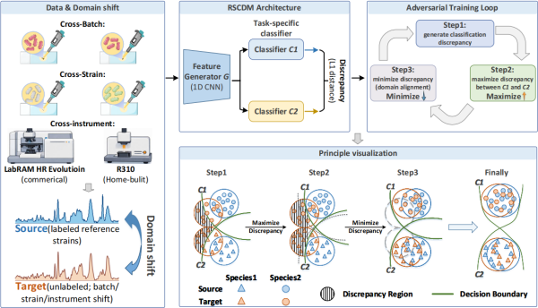 近日,中國科學(xué)院蘇州生物醫(yī)學(xué)工程技術(shù)研究所提出了一種面向拉曼光譜跨域遷移的拉曼光譜分類差異模型(RSCDM)。該方法基于無監(jiān)督領(lǐng)域自適應(yīng)思想,構(gòu)建了“特征提取器+雙分類器”協(xié)同框架,通過主動放大并逐步縮小兩個分類器對目標(biāo)域樣本的預(yù)測差異,動態(tài)識別偏離源域分布的樣本,并引導(dǎo)模型完成面向任務(wù)決策邊界的特征對齊,從而有效緩解跨批次、跨樣本和跨儀器引起的光譜差異問題。在基于拉曼光譜的病原菌種鑒定任務(wù)中,顯著提升了模型在復(fù)雜多菌種分類場景下的識別穩(wěn)定性、準(zhǔn)確性和泛化能力。