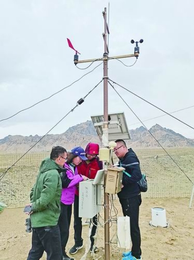 王建萍(左二)等人在安裝高寒干旱區氣象環境設備。受訪者供圖
