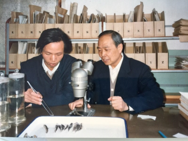 楊君興(左)在禇新洛(右)的指導下做魚類研究。中國科學院昆明動物研究所供圖
