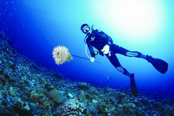 黃暉團隊成員袁濤清理珊瑚上的長棘海星。南海海洋所供圖