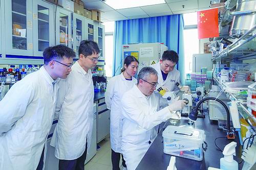 薛天(右二)與團(tuán)隊(duì)成員在做實(shí)驗(yàn)。受訪者供圖