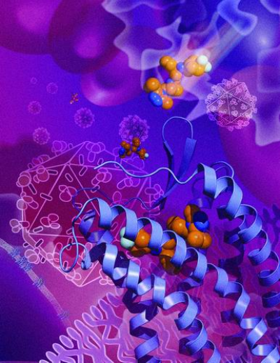 吳蓓麗團隊通過解析蛋白質分子結構,揭示了HIV感染人體細胞的機制。圖中紫色螺旋為CCR5蛋白分子,橘黃色和藍色小球為馬拉維諾,多面體為HIV。